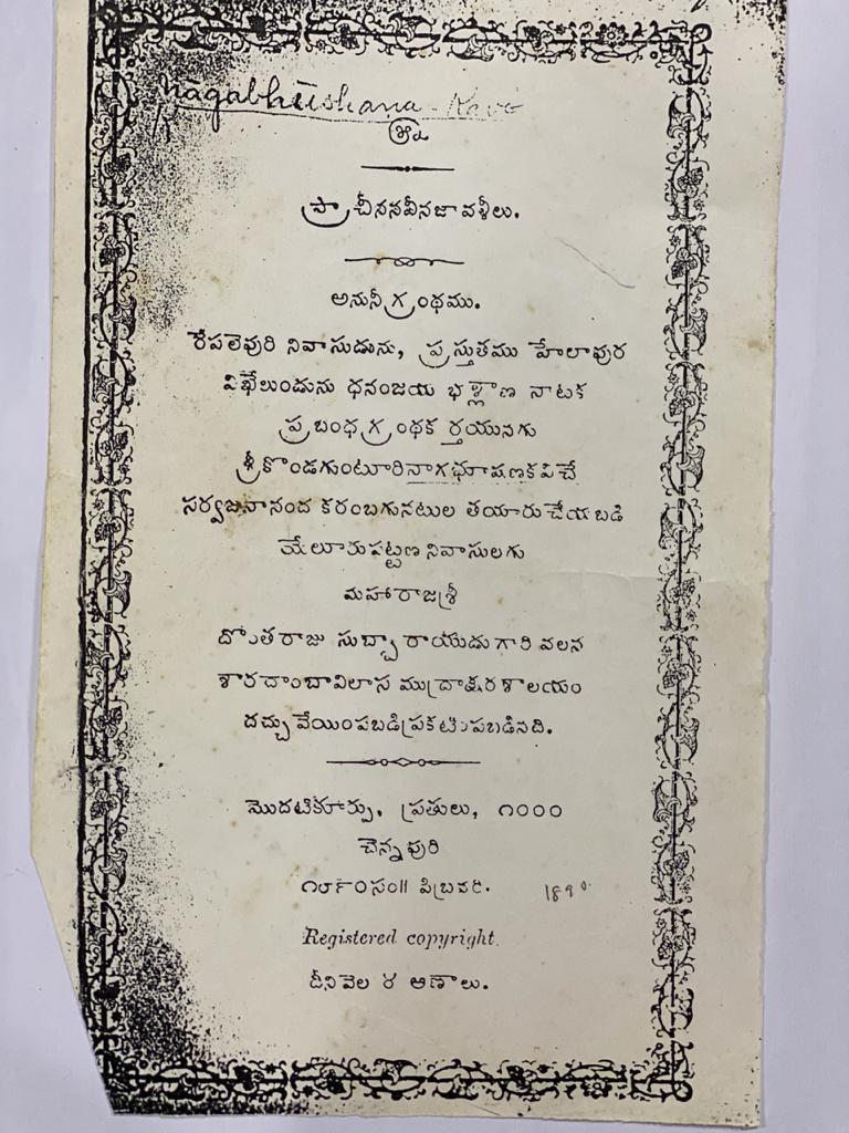 Compiled / written by “SrI konDagunTUri nAgabhUshaNa kavi”. First edition was in 1890 February, in “chennapuri”