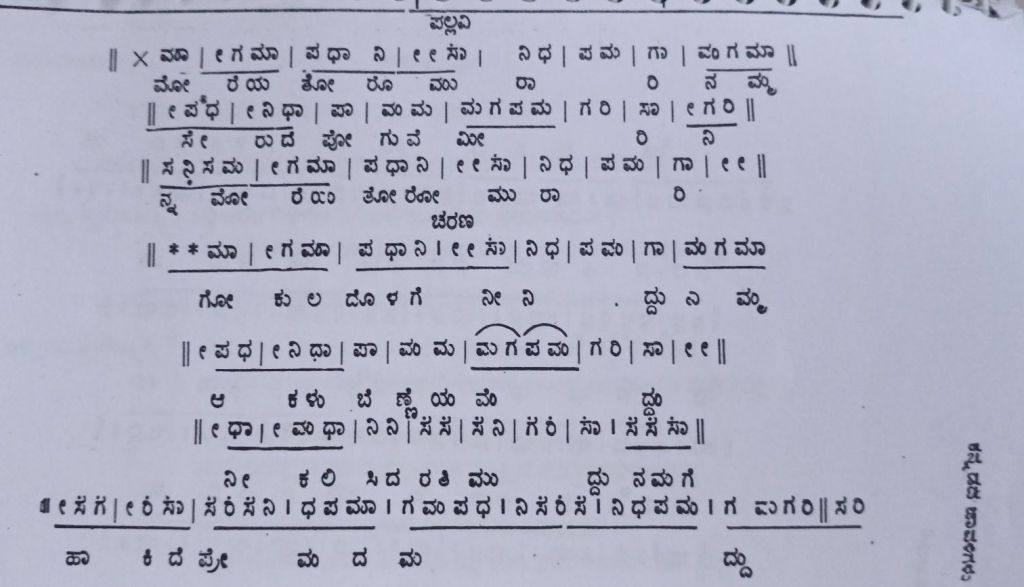 | చరణం charaNam 1 | గోకుల దొళగె నీనిద్దు నమ్మ ఆకళు బెణ్ణెయ మెద్దు నీ కలిసిదె రతి ముద్దు నమగె హాకిదె ప్రేమద మద్దు | gOkula doLage nIniddu namma AkaLu beNNeya meddu nI kaliside rati muddu namage hAkide prEmada maddu |