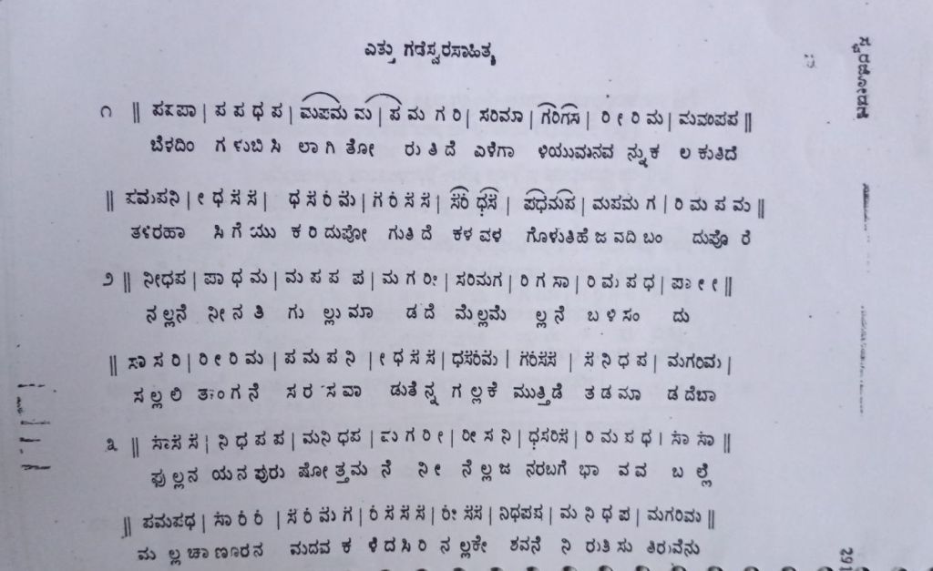| పల్లవి pallavi | గణికెయర నెరెమోహ నిజవెం దెణిసలాగదు రసికరాదవర్ హణవనిత్తరె హగలె రమివరు గుణవన్నీక్షిసరెందిగాదరూ | gaNikeyara neremOha nijavem deNisalAgadu rasikarAdavar haNavanittare hagale ramivaru guNavannIkshisarendigAdarU |