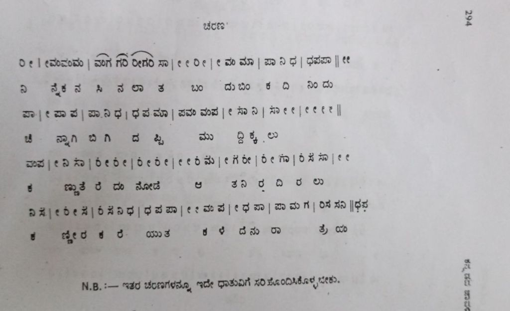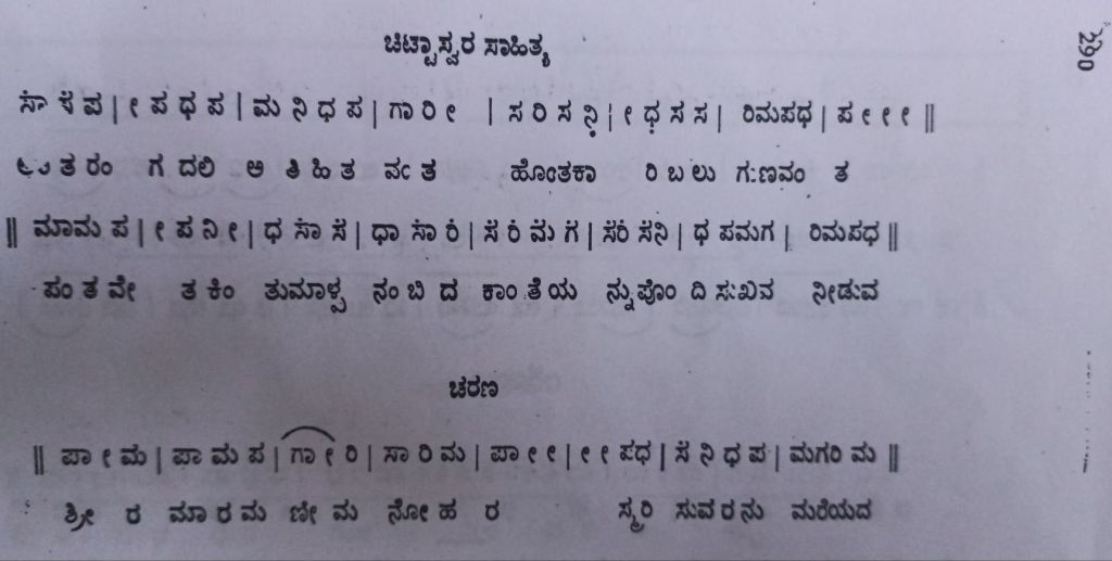 | చిట్టా స్వరసాహిత్య chiTTA svarasAhitya | అంతరంగదలి అతిహితవంత హొంతకారి బలుగుణవంత పంతవేతకింతు మాళ్ట నంబిద కాంతెయన్ను పొంది సుఖవ నీడువ | antarangadali atihitavanta hontakAri baluguNavanta pantavEtakintu mALTa nambida kAnteyannu pondi sukhava nIDuva |